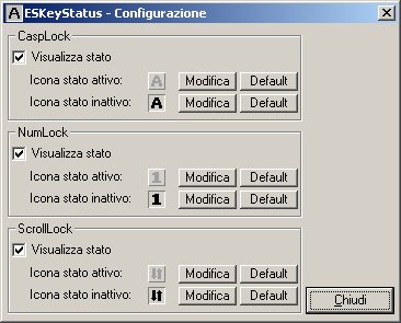 nella Traybar (la barra dell'orologio). Comodo per chi come Esteban ha una tastiera Wireless senza i relativi avvisatori luminosi! Ecco come si presenta ESKeyStatus: Clicca con il tasto destro del mouse sulla casella a sinistra per far apparire il menu di controllo: ![]() Seleziona la voce menu 'Configura' per modificare le impostazioni di visualizzazione di ESKeyStatus: